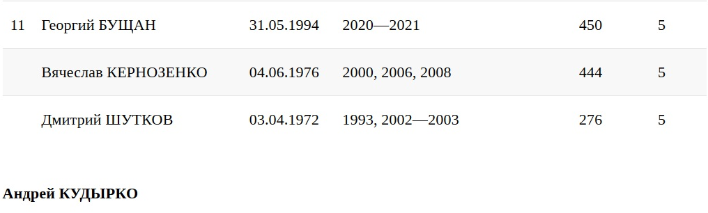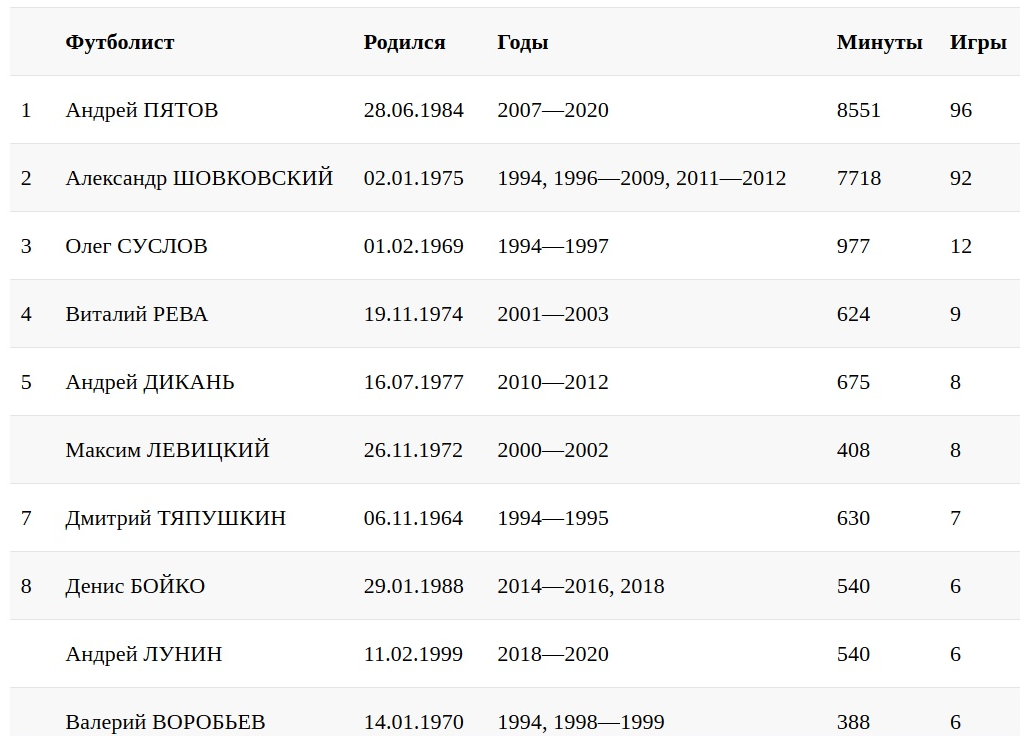 Так сложилось, что в истории нашей национальной команды были две большие вратарские эпохи. Первая — Александра Шовковского (92 матча), вторая — Андрея Пятова (96). Место в воротах всего одно, замены голкиперов по ходу матчей делаются крайне редко. Так что при наличии таких железных первых номеров провести хотя бы 5 поединков в сборной — неплохой показатель.