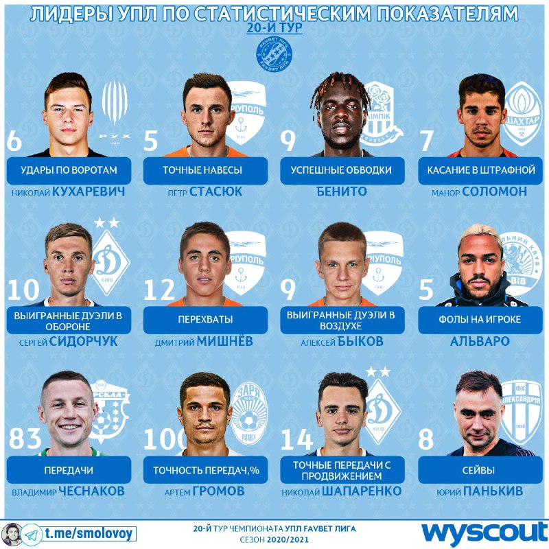 Блогер Михаил Смоловой в своем Telegram-канале рассказывает о лидерах УПЛ по статистическим показателям в 20-м туре.
