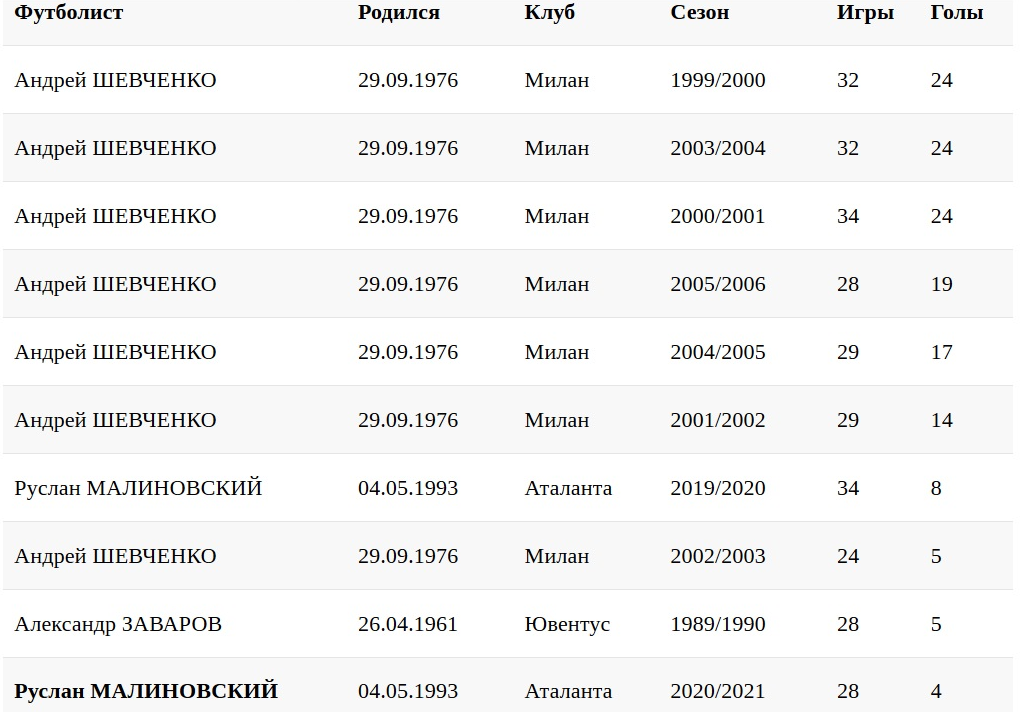 А рекордные результаты, как известно, принадлежат Андрею Шевченко. Он трижды забивал по 24 мяча за один чемпионат Италии. Еще трижды — более 10-ти мячей.