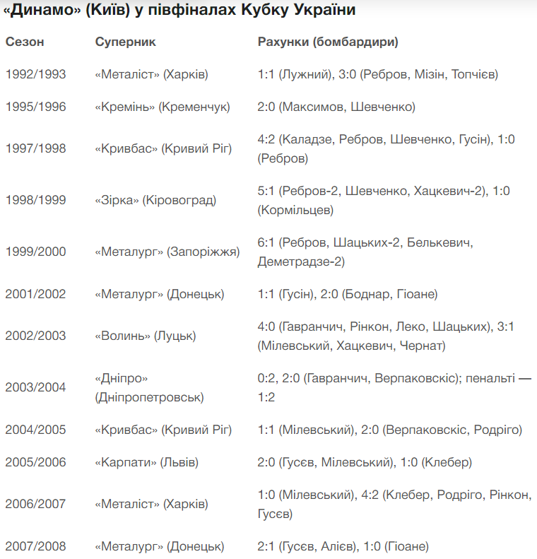 За 30 сезонів розіграшу Кубка України київське «Динамо» дісталося півфінального раунду 20-й раз. І лише двічі з 19-ти попередніх випадків футболісти найбільш титулованого клубу України вибували з боротьби саме на цій стадії. У 2004 році на шляху став «Дніпро», у 2009-му — «Шахтар». У решті випадків динамівці проходили до фіналу.