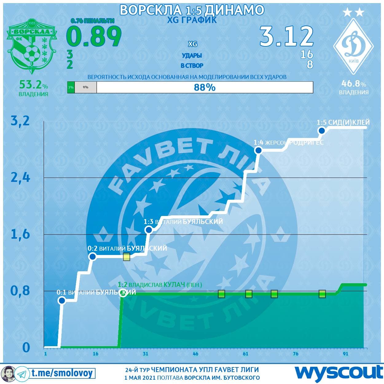Без пенальти вероятность победы киевлян составляла бы 97%, но Копиевский его увидел, и пока Лучи придумывает формулировку, констатируем итоговые 88% вероятности.