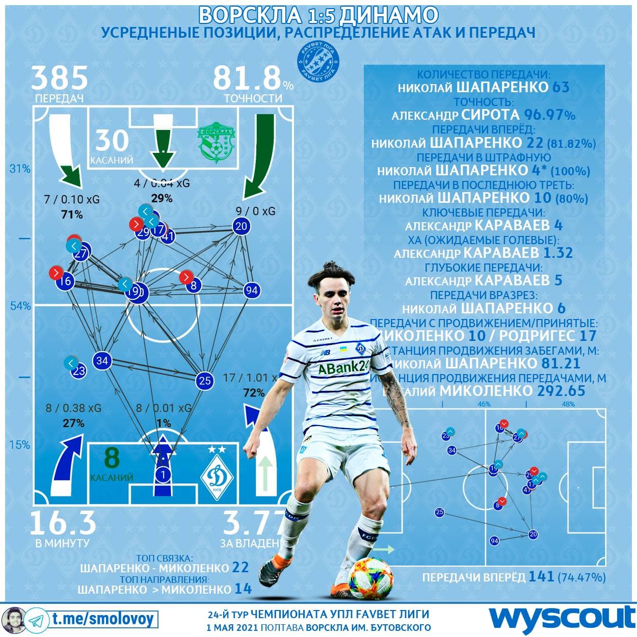 Против Ингульца Динамо выдало один из лучших темпов перемещения мяча в сезоне, высокую продолжительность одного владения и высокую точность передач (89%).