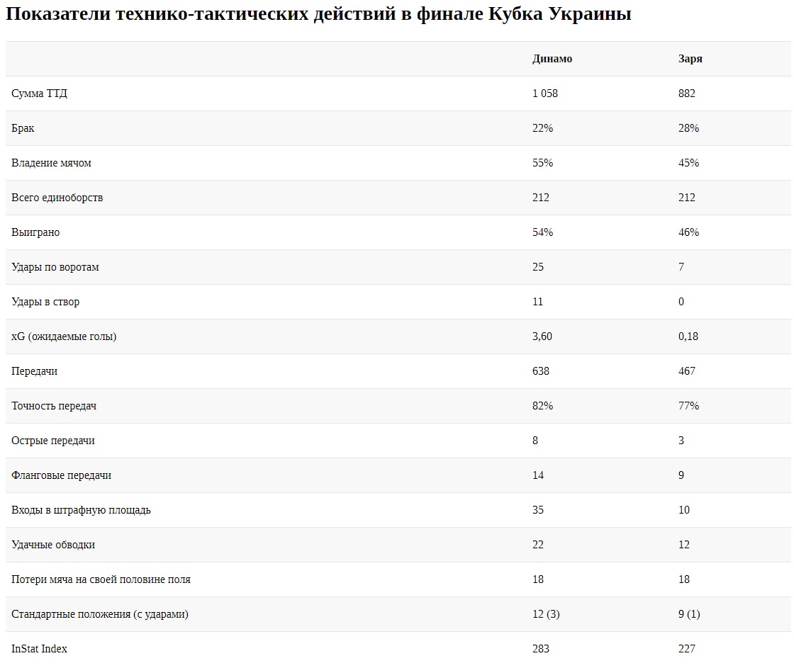 Самым полезным игроком финального поединка за Кубок Украины по оценкам InStat стал полузащитник Динамо и сборной Украины Виктор Цыганков, пишет zbirna.com. В поединке с Зарей рейтинг эффективности его игры, InStat Index, составил 358 баллов. В активе автора победного гола за 120 минут было 104 ТТД с браком 19%, восемь выигранных единоборств, девять ударов по воротам и две ключевые передачи. В тройку лучших игроков матча также вошли Александр Караваев (324 балла) и Илья Забарный (299 баллов). Самый высокий рейтинг в Заре получил голкипер Никола Василь (296 баллов), который отразил 10 ударов.