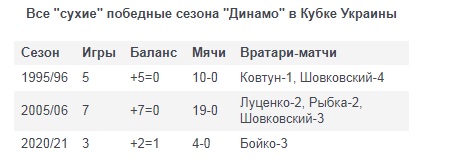 Такого результата, когда "Динамо" стало обладателем Кубка Украины, не пропустив в ходе розыгрыша ни одного гола в основное и дополнительное время, наша команда достигла в третий раз.
