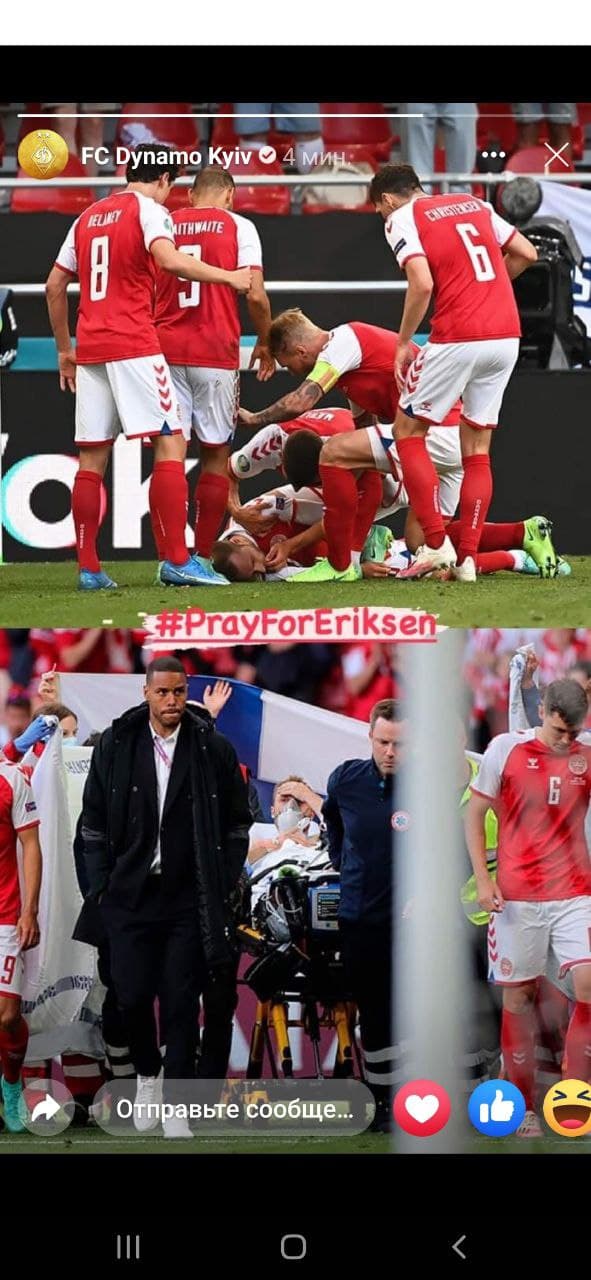 "Динамо" посредством своей официальной страницы в Instagram выразило поддержку потерявшему сознание полузащитнику сборной Дании Кристиану Эриксену во время матча с Финляндией.