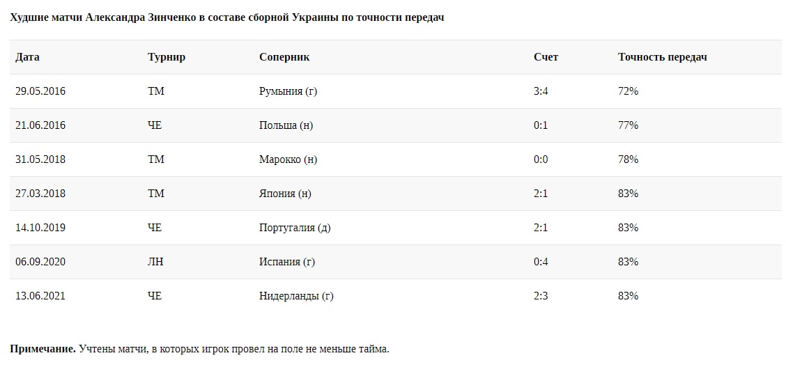 Один из лидеров сборной Украины Александр Зинченко сыграл в матче против Нидерландов не так, как приучил наших болельщиков, пишет zbirna.com. В активности ему отказать было сложно, как и в желании конструировать игру, но ошибок в передачах хватало. В итоге Зинченко провел один из худших поединков в карьере сборной по точности пасов (83%) — хуже было только в трех матчах, а тут проанализированы игры, в которых футболист провел на поле не меньше тайма. Впрочем, не стоит забывать, что во встрече с нидерландцами Александр вошел в тройку лучших игроков нашей сборной по числу передач вперед (32) и занял первое место по количеству пасов в финальную треть (19).