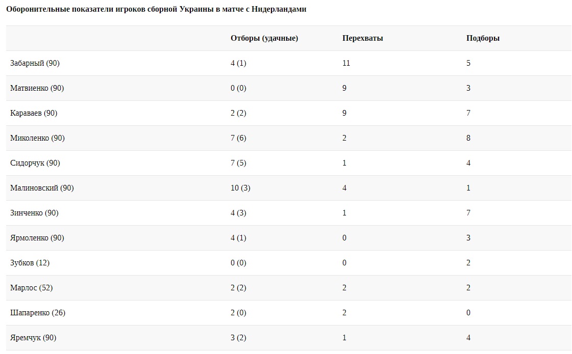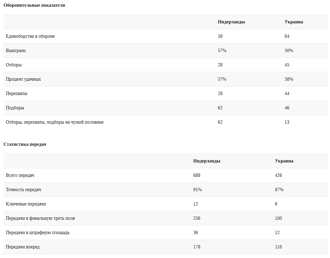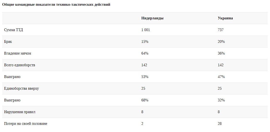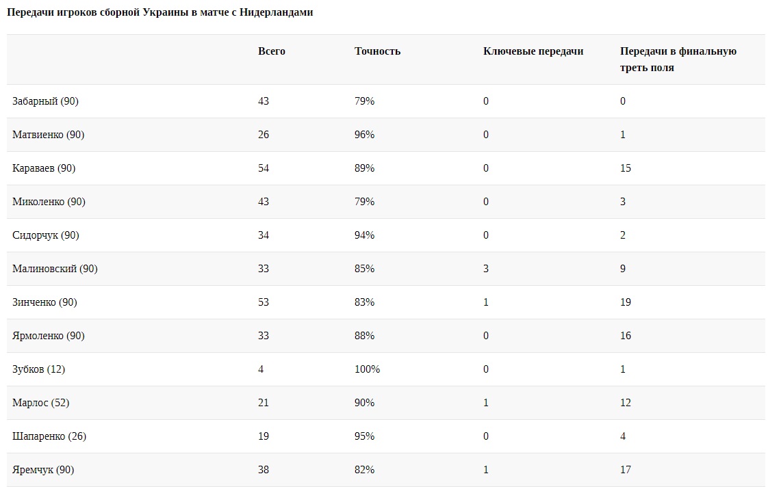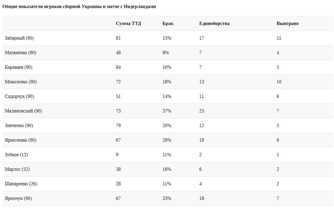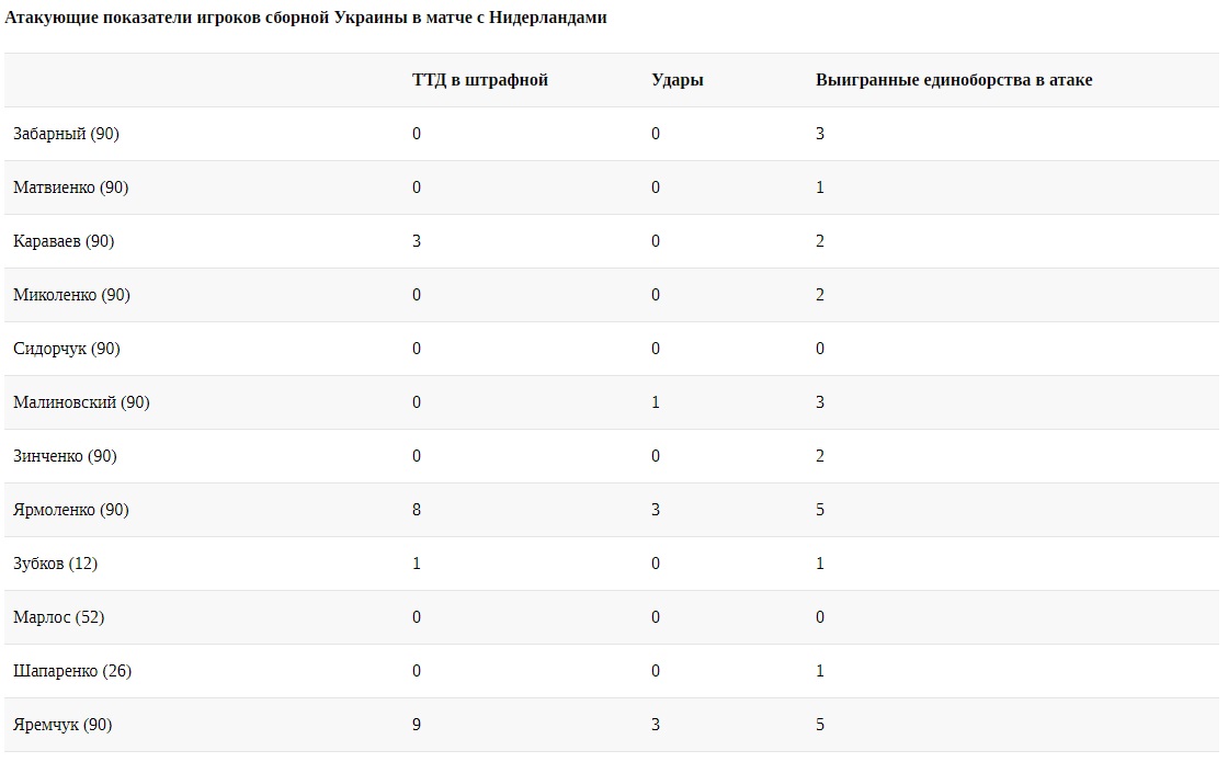 Конечно, поединок с Нидерландами был далек от оптимальной игры нашей сборной. На своей половине поля мы допускали много потерь, а в атаке порой не хватало элементарного наполнения штрафной площади. Ведь 81% всех ТТД в этой зоне выполнили Андрей Ярмоленко и Роман Яремчук, которые в итоге и забили голы. У нас в чужой штрафной площади встречались с мячом только четыре футболиста, а у Нидерландов — девять.