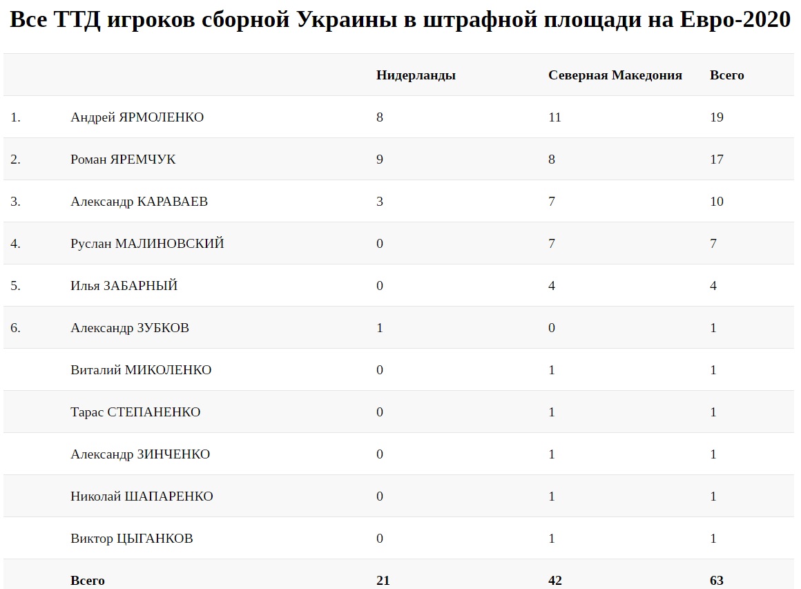 Лучший игрок сборной Украины по ТТД в штрафной площади соперника — Андрей Ярмоленко. На втором месте — Роман Яремчук. Вдвоем эта парочка выполнила 57% таких действий. Отметим и Александра Караваева, который, будучи номинальным защитником, активно заходит в опасную зону. После перевода на левый фланг полузащиты начал там появляться и Руслан Малиновский.