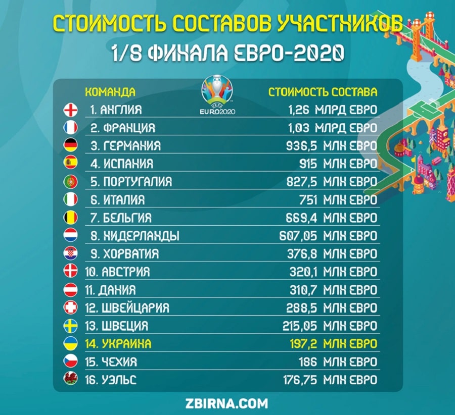 Среди 16 участников 1/8 финала Евро-2020, которая начинается уже сегодня, сборная Украины занимает 14-е место по стоимости состава (197,2 млн евро), утверждает zbirna.com ссылаясь на немецкий портал transfermarkt.de.