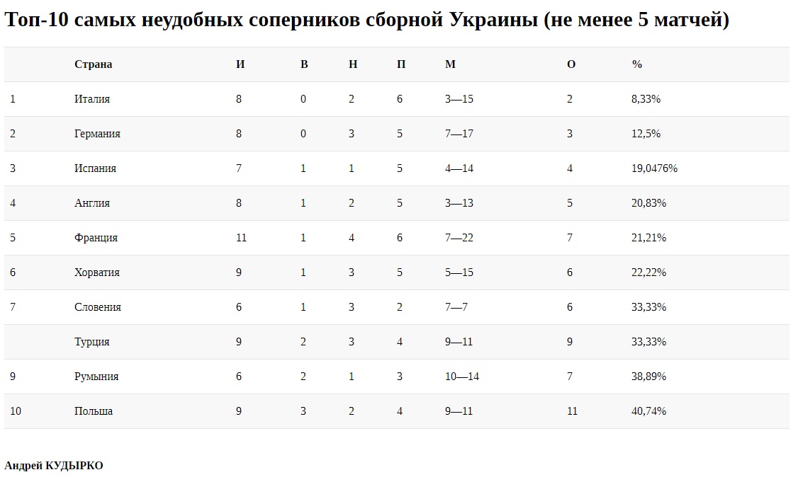 Четвертьфинальный матч Евро-2020, проигранный сборной Украины со счетом 0:4, поднял команду Англии в рейтинге наших самых неудобных соперников. До этого дня британцы занимали 6-е место, сейчас поднялись на 4-е, пишет zbirna.com.