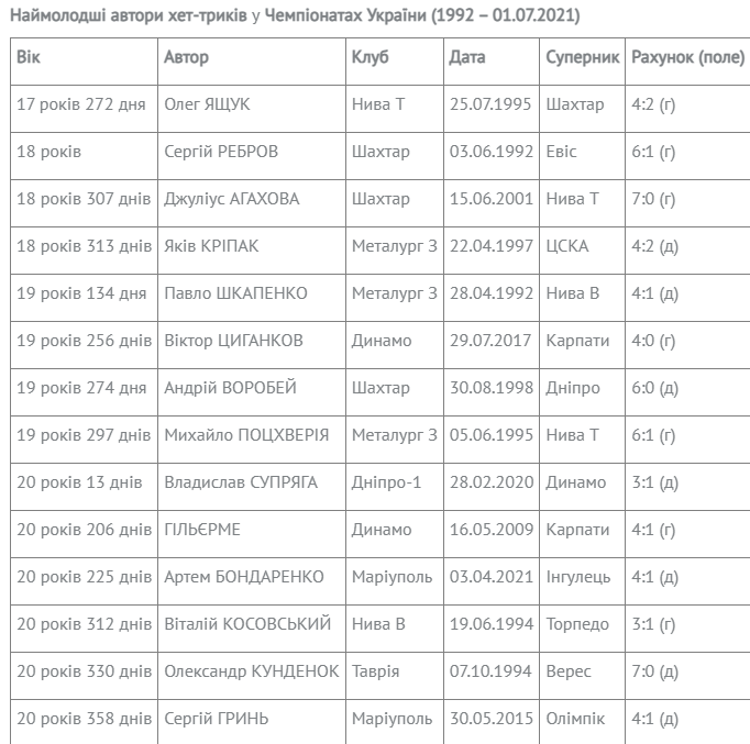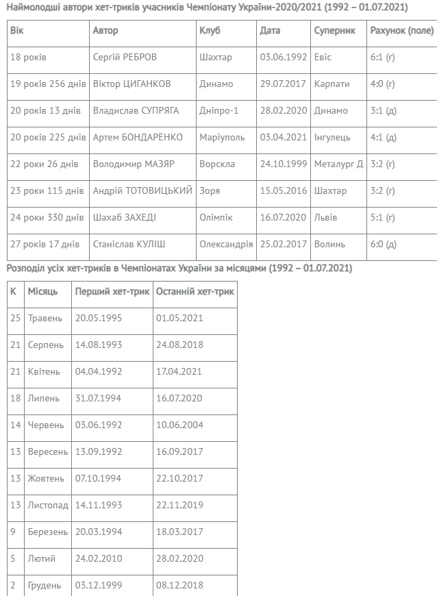 У минулому 30-му чемпіонаті України було зафіксовано лише три хет-трик, причому усі у період майже одного місця: з 3 квітня по 1 травня цього року.