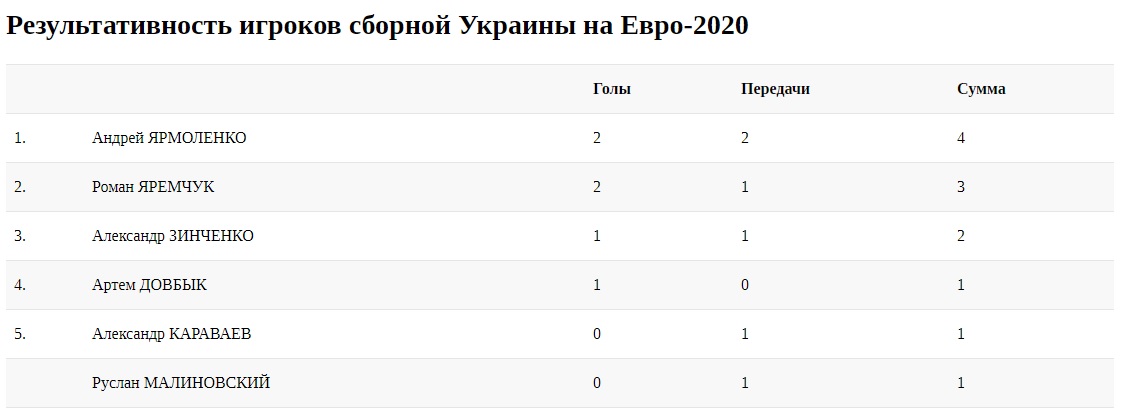 В пяти матчах Евро-2020 сборная Украины забила шесть мячей, и самое активное участие в них принимали шесть игроков нашей команды. Лучшим футболистом по системе гол + пас стал Андрей Ярмоленко, у которого четыре результативных действия — два забитых мяча и две голевые передачи, пишет zbirna.com.