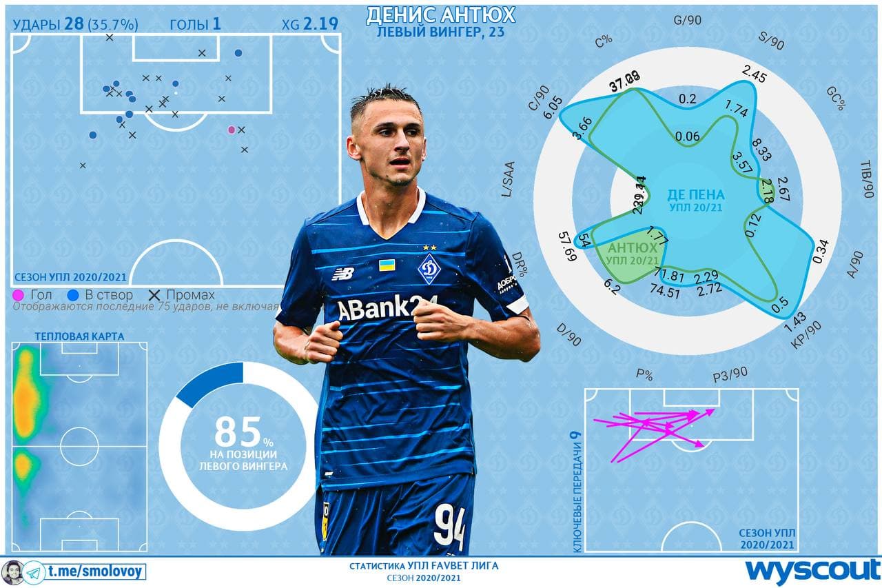 Замена не прямая - профили разные. Антюх тоже левый вингер (там сыграл 85% игрового времени в прошлом сезоне УПЛ), но он «бегунок». Де Пена ближе к фланговому плеймейкеру. Для аналогии часто использую Баварию с дуэтом Роббен (красивый) и Рибери (умный). Здесь где-то тоже самое.