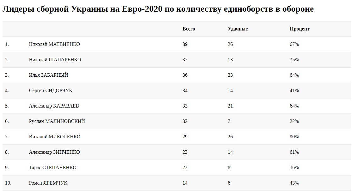 В пяти матчах на Евро-2020 футболисты сборной Украины вступали в оборонительные единоборства 339 раз и выиграли 54% из этих дуэлей, пишет zbirna.com. По эффективности таких действий сине-желтые занимают 13-е место на турнире. Чаще всех в борьбу в защите вступал Николай Матвиенко, но самый высокий показатель успешности у Виталия Миколенко. Достойно отыграли в этом плане Илья Забарный и Александр Зинченко. Провальный показатель у Руслана Малиновского, ниже своего привычного уровня действовал Тарас Степаненко.