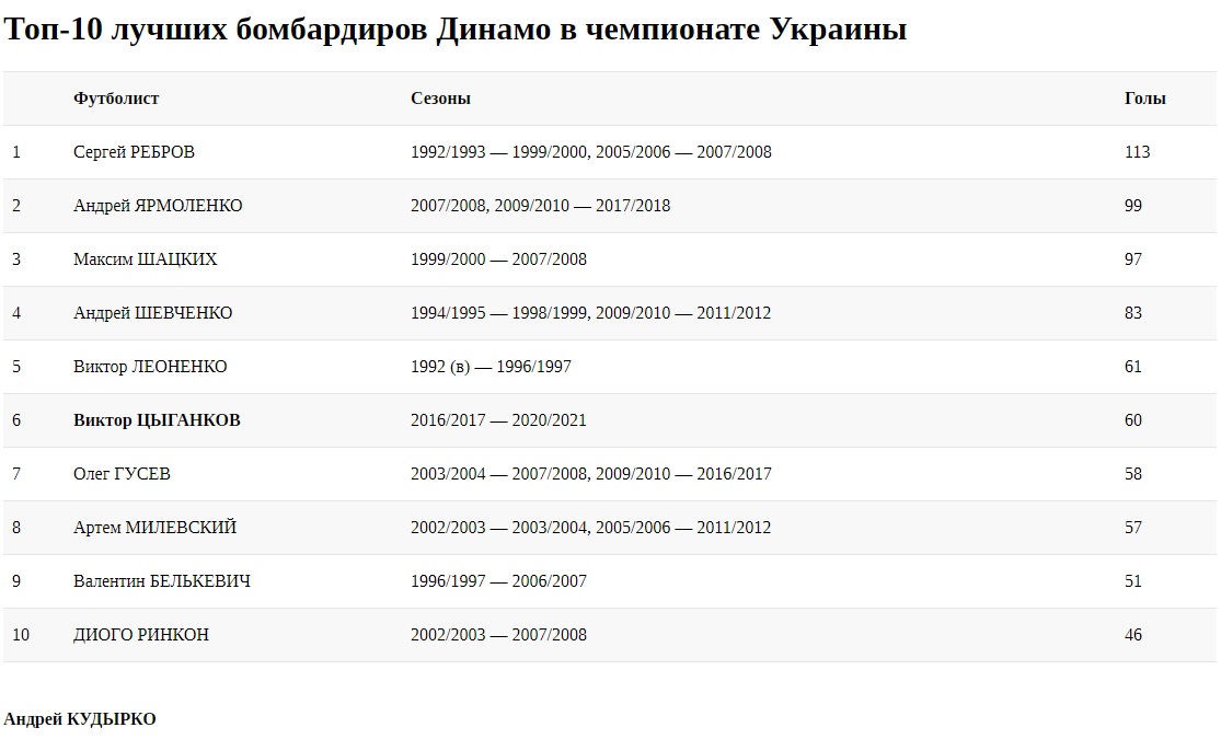 Виктор Цыганков, забив 12 голов в прошлом чемпионате Украины, поднялся в рейтинге бомбардиров Динамо в ЧУ с 9-го на 6-е место, пишет zbirna.com. Он опередил Валентина Белькевича, Артема Милевского и Олега Гусева. А сейчас дышит в затылок Виктору Леоненко. Еще один гол, и Цыганков догонит знаменитого форварда Динамо. Два — и обгонит.