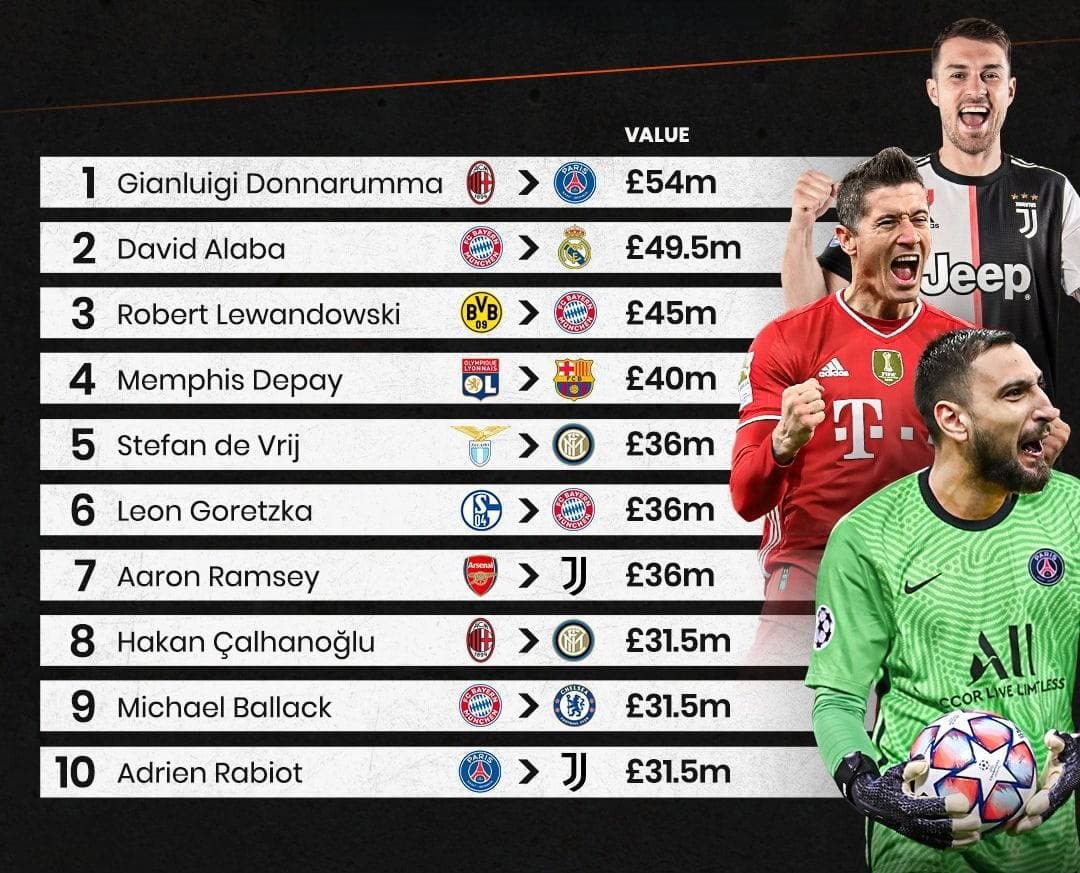 Известный портал Transfermarkt составил топ-10 переходов свободных агентов по их трансферной стоимости.