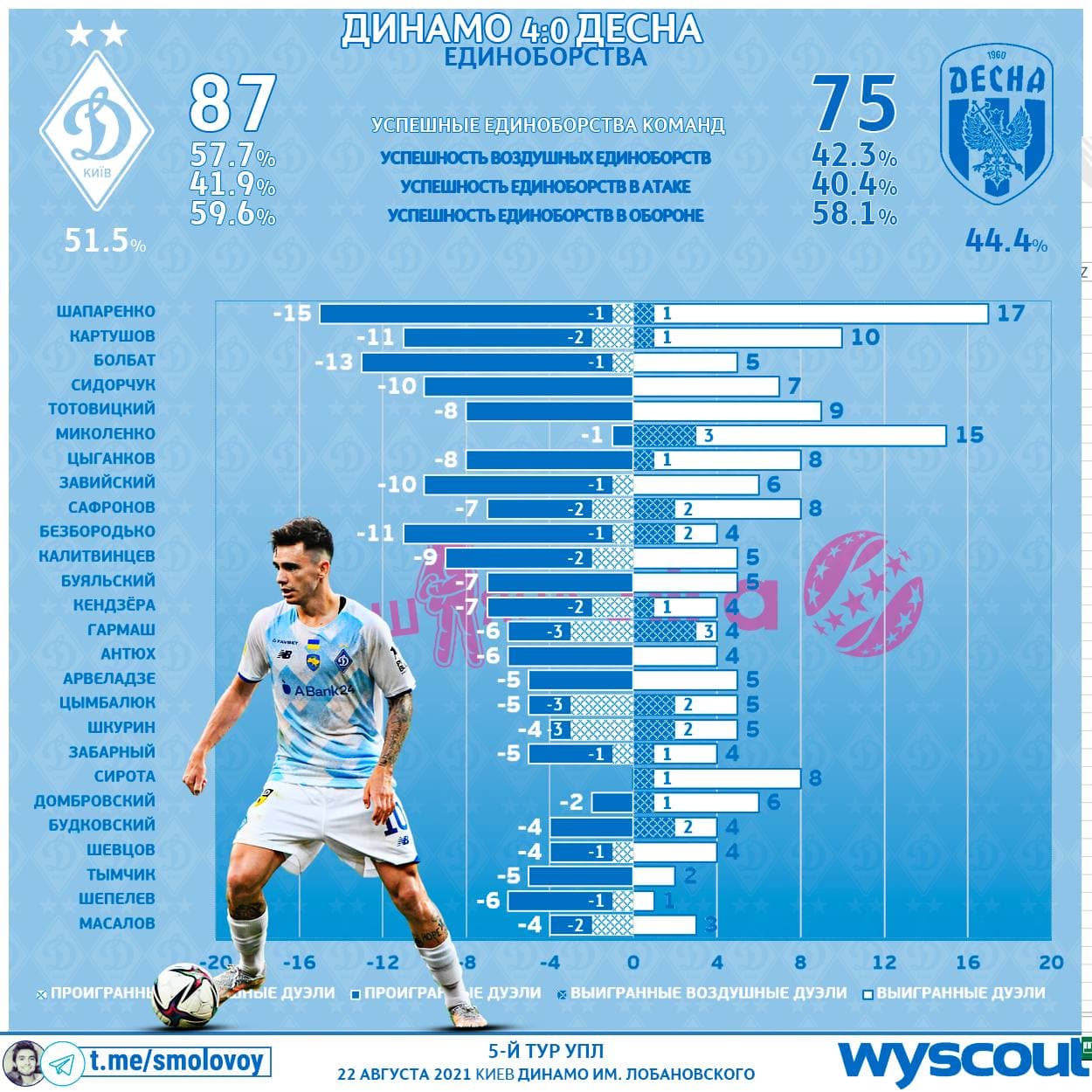 Заканчиваю. Динамо вступило в 169 единоборств, что ниже среднего за 5 стартовых туров УПЛ (181.2). Десну это характеризует не с лучшей стороны: они не успевали их навязывать. Для команды из Чернигова единоборства один из главных компонентов игры: 192.6 в среднем в 5 турах, и 169 в Киеве. Недобор.