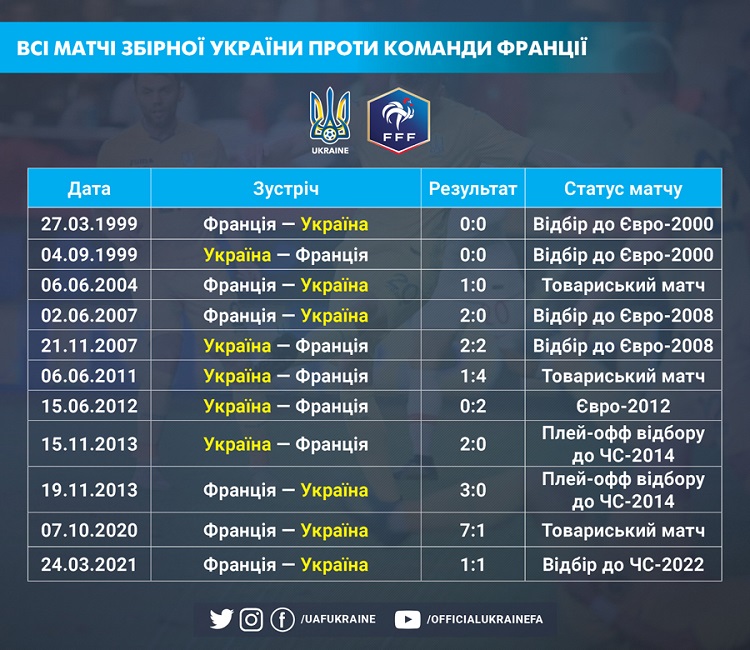 На жаль, статистика не на боці синьо-жовтих: шість разів перемогу святкували французи, одного разу виграли українці й ще чотири поєдинки закінчилися внічию. Різниця забитих і пропущених м’ячів — 22-7 на користь наших суперників.