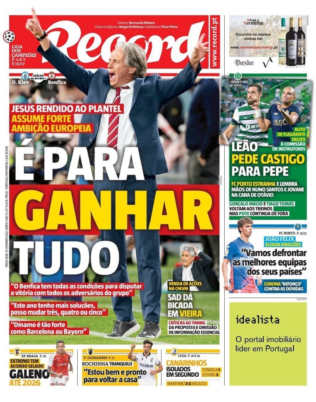 Record вынес на обложку амбициозные слова главного тренера Бенфики о необходимости победы в Киеве над Динамо.