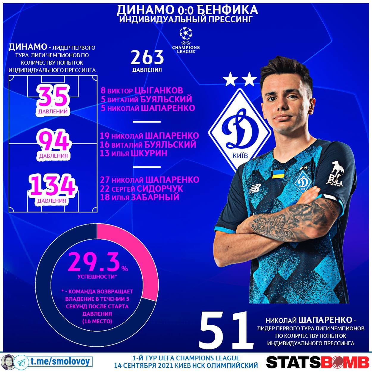 Николай Шапаренко - лидер первого тура Лиги чемпионов по количеству попыток индивидуального прессинга. 51 раз Коля «прыгал» на соперника, и 12 раз команда возвращала владение в течении 5 секунд после этого. Коля стал лидером в центре поля (19 раз) и первой трети (27). Есть в активе даже 5 попыток высокого давления в финальной трети.