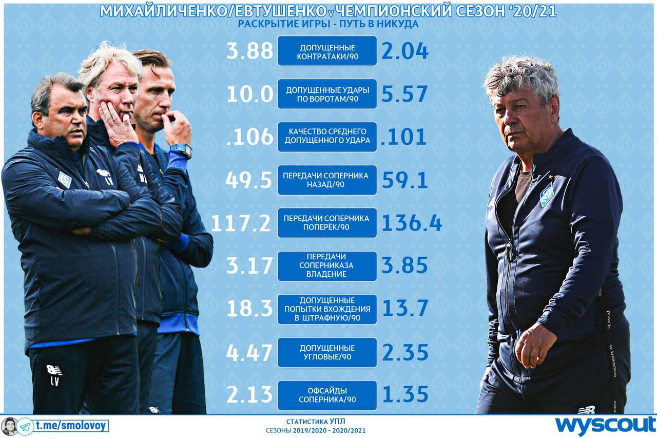 ⁃ если при Михайличенко соперник отдавал 123.94/90 передач вперёд, то в чемпионский сезон - 126.92/90 (плюс минус одно и тоже)