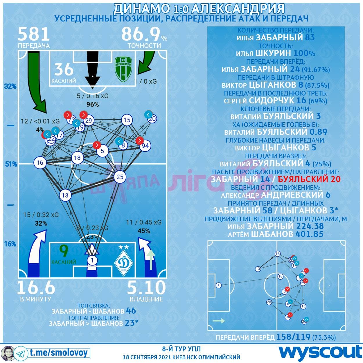 Нельзя пройти мимо «повышения» в статусе Забарного на один отдельный матч. Что так же оказало влияние на дистрибуцию в целом. Обычно Сирота у них там за старшего, но против Александрии Илья превзошёл Шабанова в созидательных пасовых метриках: отдал больше передач вперёд (24 - 21), больше точных длинных (3 - 0), больше в последнюю треть (16 - 7), больше с продвижением (14 - 7). Плюс у Ильи лучшая дистанция продвижения в забегах.