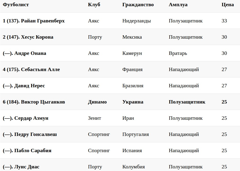Больше всего в этой десятке представителей Аякса (четверо). Еще по два игрока туда делегировали Порту и Спортинг.