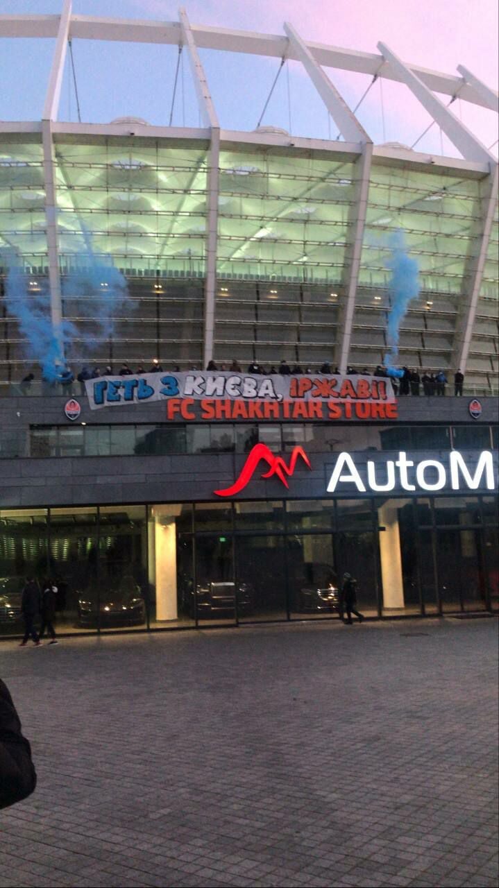 Ультрас "Динамо" вывесили баннер "Геть з Києва, іржаві!" над фан-шопом "Шахтера" на "Олимпийском"