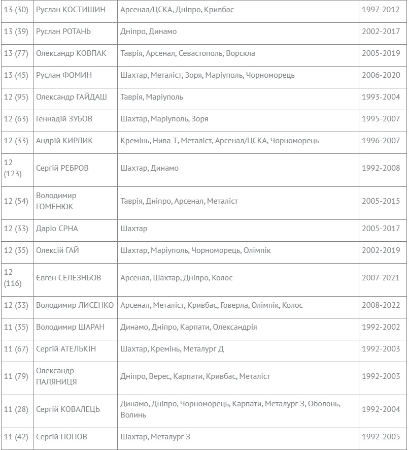 ... Кроме традиционных исторических списков гвардейцев и лучших бомбардиров всех чемпионатов Украины, вызывает интерес и список голеадоров с наибольшим количеством сезонов, в которых они забивали хотя бы один мяч в ворота соперников. И лидерство в этом рейтинге сейчас разделяют трое футболистов – полузащитник Сергей Мизин, защитник Вячеслав Чечер и действующий нападающий «Зари» Александр Гладкий, в активе которых по 16 забивных сезоны. Может увеличить число забивных чемпионатов до 13-ти действующий футболист Евгений Селезнев («Минай») и до 12-ти - Валерий Федорчук («Рух»). Среди игроков, что уже забивали голы в чемпионате-2021/22, выделим тех, которые довели количество своих голевых сезонов до 10-ти. Это Младен Бартулович («Ингулец»), Денис Гармаш («Динамо»), Артем Громов («Заря») и Дентинью («Шахтер»).