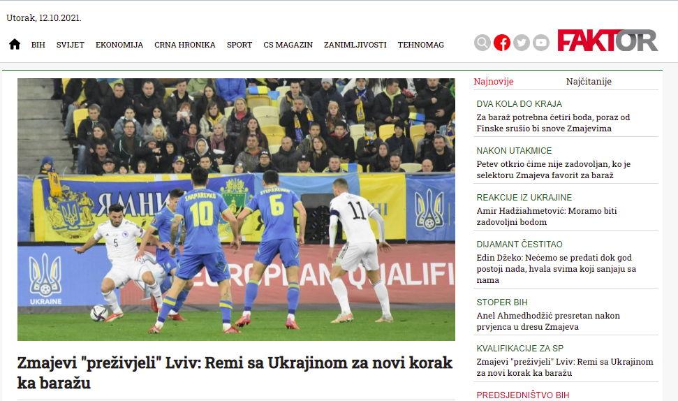 Сборная Украины вчера во Львове в рамках отбора ЧМ-2022 сыграла вничью с командой Боснии и Герцеговины (1:1). Боснийская пресса считает шансы своей команды на выход в плей-офф очень высокими, пишет zbirna.com.
