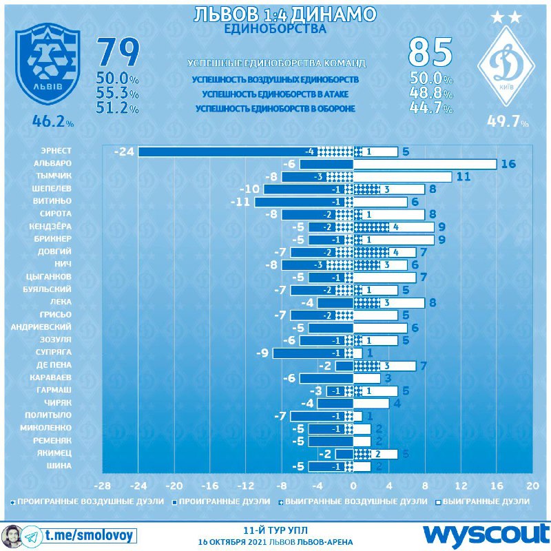 В среднем за матч Динамо в нынешнем сезоне УПЛ вступает в 170 единоборств, во Львове - 171. Потому особо никто не перетрудился, за счёт скорости и качества перемещения мяча удалось минимизировать прямые контакты. Много мячей было забрано без борьбы.