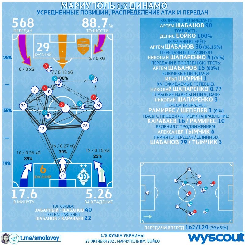Темп перемещения мяча упал до 16.6 передач в минуту (что только на 1.2 выше привычного для Мариуполя, а не на 2.5, как в первом тайме). Потому даже такой убогий соперник начал успевать перестраиваться. Хотите орнуть? Тогда смотрите: во втором тайме Мариуполь выполнил 26 точных передач в последнюю треть, а у Динамо их лишь 14. А зачем потеть? 2:0 же, игра сделана.