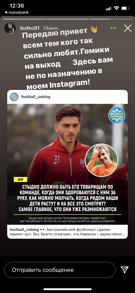 Защитник Богдан Бутко сделал репост в сторис своей цитаты о каминг-ауте австралийского футболиста «Аделаиды Юнайтед» Джошуа Кавалло.