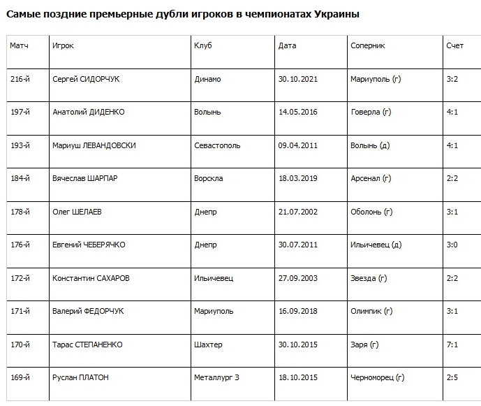 В поединке с «Мариуполем» (3:2) Сергей Сидорчук сделал первый дубль в чемпионатах Украины. Причем премьерный дуплет капитан «Динамо» оформил позже, чем кто-либо - в 216-м матче. Прежний рекорд УПЛ, принадлежавший Анатолию Диденко, 30-летний полузащитник киевлян превзошел на 19 игр.