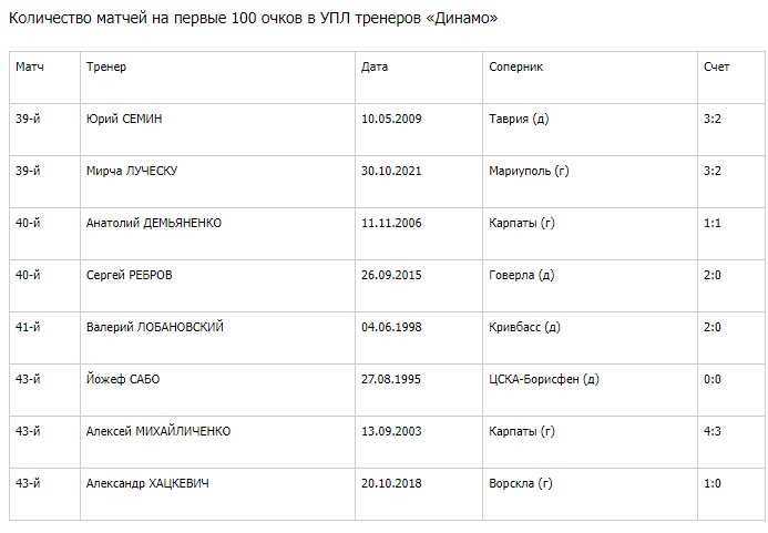 «Динамо», выиграв у «Мариуполя» (3:2), заработало 100-е очко в чемпионатах Украины под руководством Мирчи Луческу. Динамовскую «сотню» румынский тренер отпраздновал в 39-м матче и тем самым повторил клубное достижение киевлян 12-летней давности, принадлежащее Юрию Семину.