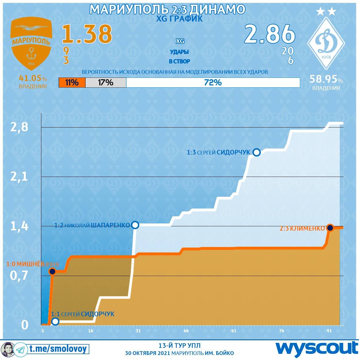 Вероятность победы Мариуполя - 11%, вероятность ничьи - 17%. Исходя из качества и количества моментов победа Динамо вопросов не вызывает - 72% симуляций закончились в пользу киевлян. Но, неужели, оба наших Александра на 30’’ и 84’ не могли находиться в правильной психологической кондиции? Откуда это всё берётся? Думали уже во время матча, что надеть на Хеллоуин к подружкам?! - написал Смоловой в своем телеграм-канале.