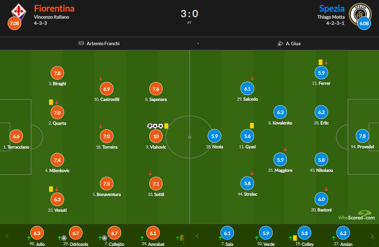 Порталы WhoScored и SofaScore оценили игру участников матча 11-го тура Серии А «Фиорентина» – «Специя» (3:0).