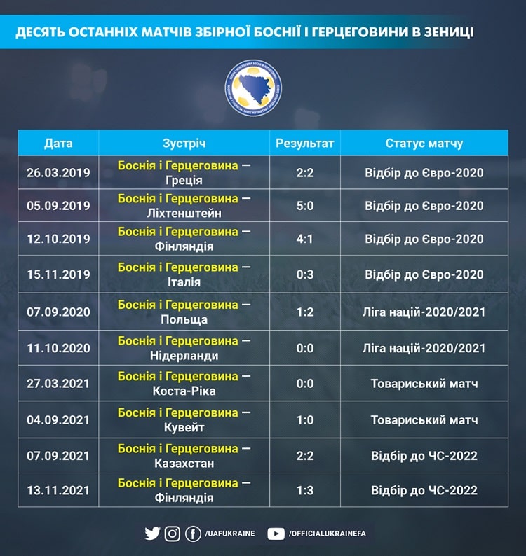 Сегодня в Зенице на стадионе «Билино Поле» состоится матч последнего тура группового раунда отбора ЧМ-2022, в котором сборная Боснии и Герцеговины будет принимать национальную команду Украины (21.45).