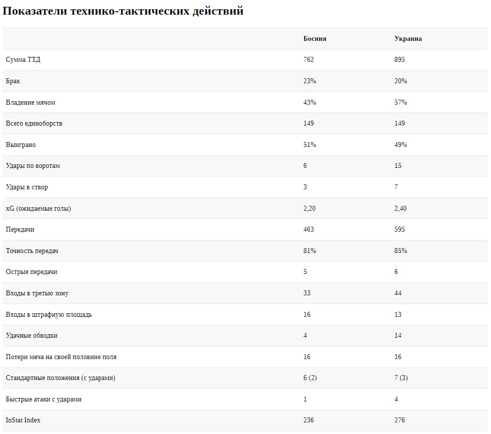 Самым полезным игроком поединка Босния — Украина (0:2) по оценкам InStat стал полузащитник сине-желтых Александр Зинченко. Рейтинг эффективности его игры составил 31 балл. В активе универсального хавбека Манчестер Сити было 101 ТТД с браком 18%, четыре обводки, три удара по воротам, шесть выигранных единоборств и семь перехватов, пишет zbirna.com.