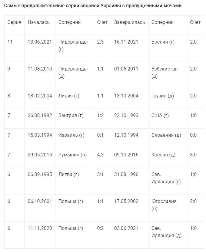 Выиграв у Боснии и Герцеговины со счетом 2:0, сборная Украины прервала две свои «рекордные» серии с пропущенными мячами: общую - из 11 матчей и гостевую - из 10. Последний раз наша национальная дружина играла на «ноль» 7 июня 2021 года, когда дома в товарищеской встрече разгромили Кипр - 4:0.