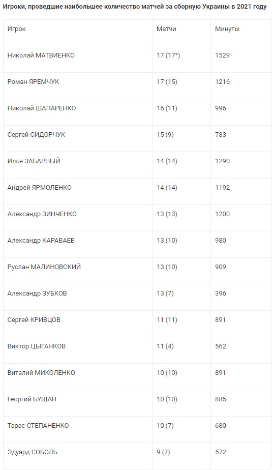 Наибольшее количество матчей за сборную Украины в 2021 году провели Николай Матвиенко и Роман Яремчук - по 17. При этом защитник горняков, во всех встречах попадавший в основу, отыграл в общей сложности 1529 минут, а форвард «Гента» и «Бенфики», дважды выходивший на замену - 1216. Любопытно, что больше времени, чем Яремчук, провел на поле Илья Забарный - 1290, который от свистка до свистка сыграл 14 матчей.