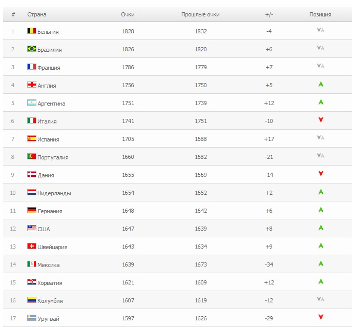 ФИФА опубликовала очередной рейтинг национальных сборных, который учитывает выступления команд за последний месяц.