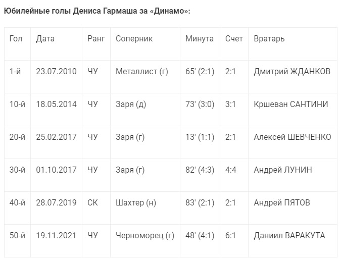 В матче с «Черноморцем» Денис Гармаш забил свой 50-й мяч в рядах «Динамо». Он стал 11-м игроком киевлян, достигшим этого рубежа за годы независимости. 33 раза Гармаш поражал ворота соперников в чемпионатах Украины, по 8 - в еврокубках и Кубке Украины, 1 - в Суперкубке Украины. Больше всего мячей он забил «Александрии» и «Заре» - по 4. Чтобы войти в динамовский бомбардирский «Клуб 50» Денису понадобилось 11 лет 119 дней, начиная с премьерного гола за бело-синих 23 июля 2010 года в гостевом матче УПЛ с «Металлистом».