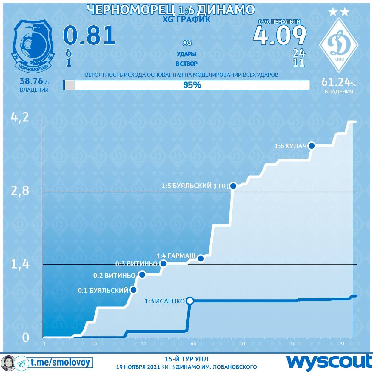 Если смотреть на моменты категории big chances, то они почти повторяют счёт: 1-7 в пользу Динамо.