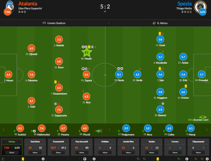 Авторитетный статистический портал WhoScored поставил оценки игрокам, принявшим участие в матче 13-го тура итальянской Серии А «Аталанта» – «Специя» (5:2).