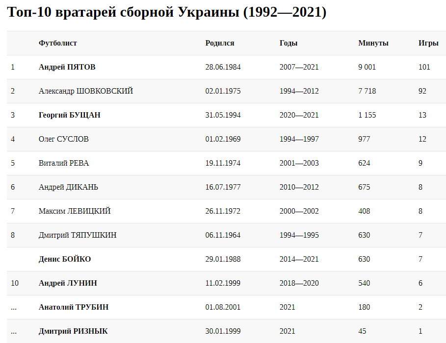 Так уж исторически сложилось, что вратарям сборной Украины очень сложно добраться до отметки в 10 матчей. Первым ее преодолел Олег Суслов (05.10.1996), который 29 марта 1997 года провел 12-й и последний поединок в национальной команде.