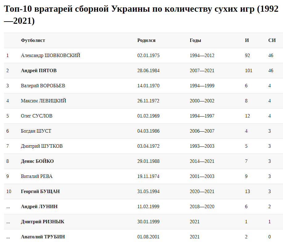 Георгий Бущан не пропускал только в 3 из 13-ти поединков (правда, вошел в топ-10 рейтинга в 2021-м). Последний сухой матч Денис Бойко сыграл 15 ноября 2016 года, а Андрей Лунин — 14 ноября 2019 года. Анатолий Трубин пока таких матчей вообще не имеет.