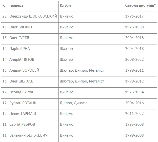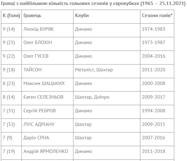 Гравці українських клубів, які провели найбільшу кількість сезонів у єврокубках (1965 – 25.11.2021)