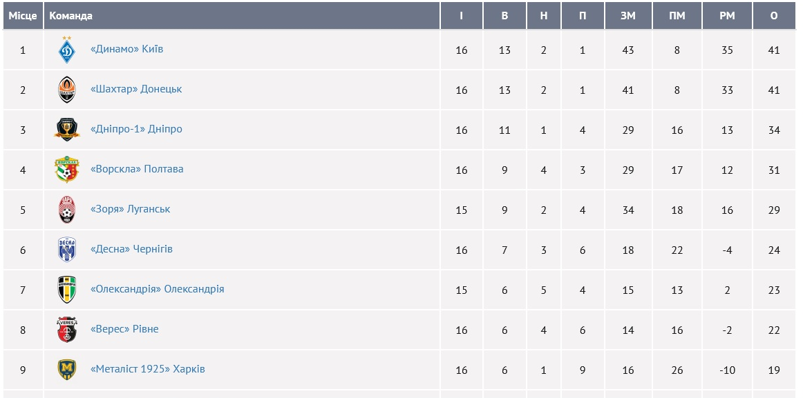 Турнирная таблица чемпионата Украины после 16-ти туров
