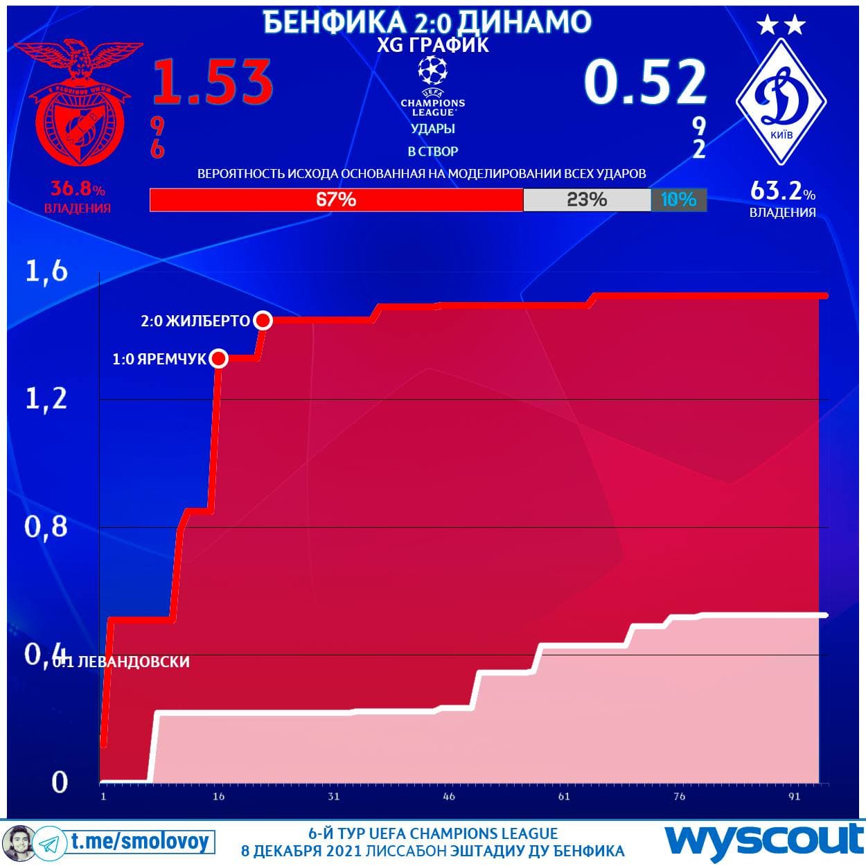 У нас мяч держался намного больше (67.93%), но мы выстрадали лишь 8 ударов на 0.30 xG.